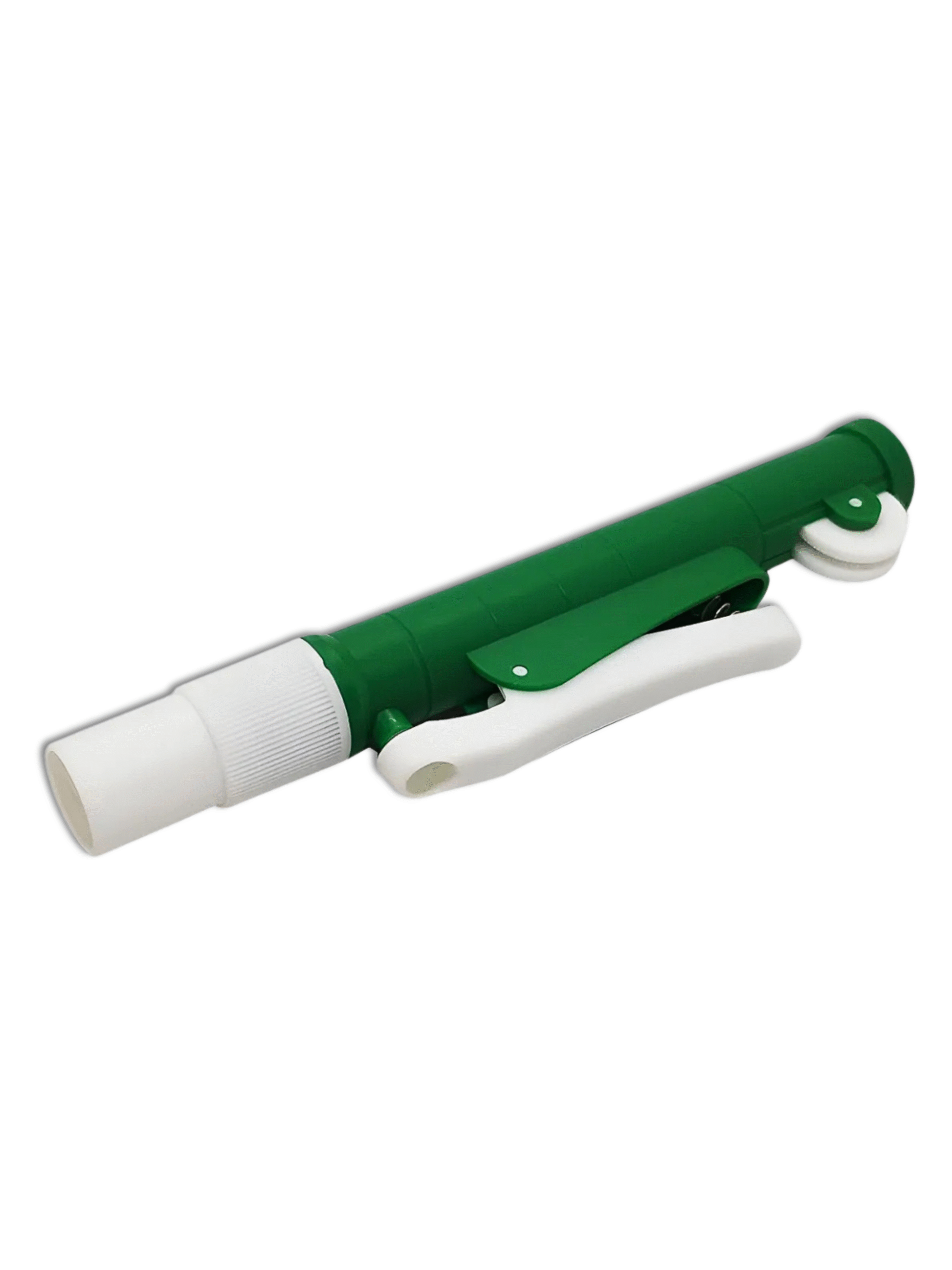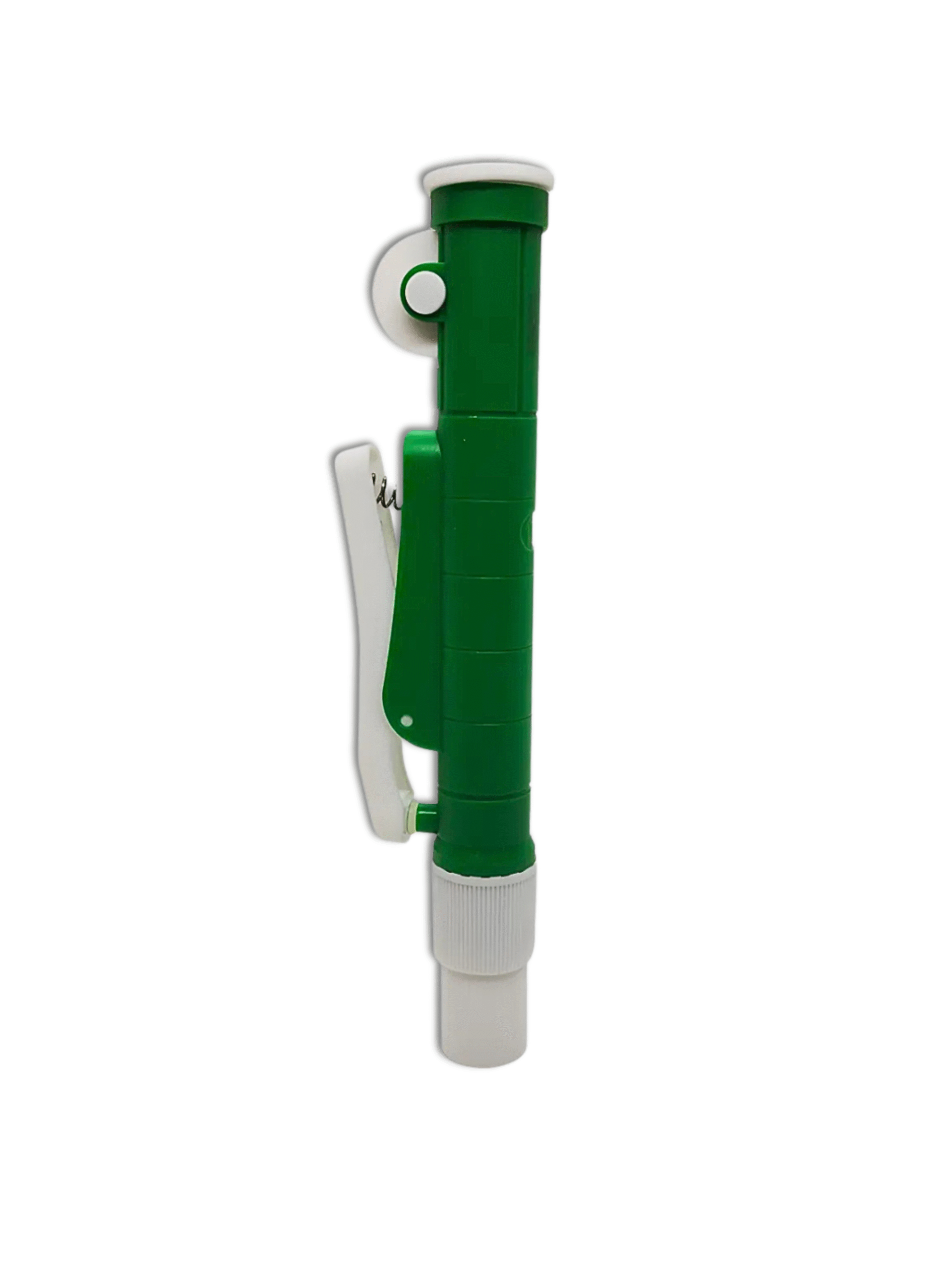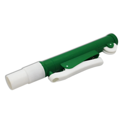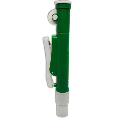 Aparelho auxiliar para aspiração e dispensação precisa em pipetas de vidro.